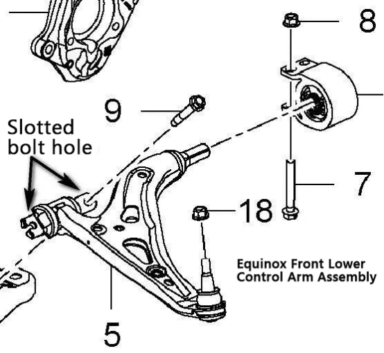 L'immagine sopra mostra il gruppo del braccio di controllo anteriore inferiore per la Chevrolet Equinox. La freccia indica la struttura del foro del bullone aperto all'interno del gruppo boccola.