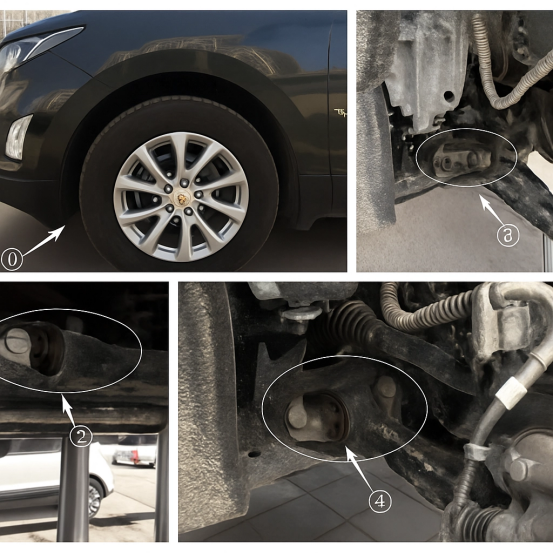 La serie precedente di foto illustra le condizioni strutturali di un guasto alla boccola del braccio di controllo della sospensione anteriore su una Chevrolet Equinox. Si avvisa gli utenti che, come mostrato nello schema sopra, il componente strutturale con potenziale guasto può essere ispezionato girando il volante fino alla sterzata completa in posizione ①. La verifica della sicurezza del gruppo boccola deve essere condotta tramite fotografie scattate in più punti, comprese le posizioni ②, e ④.