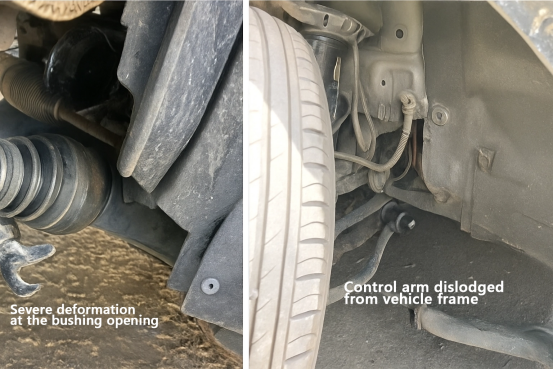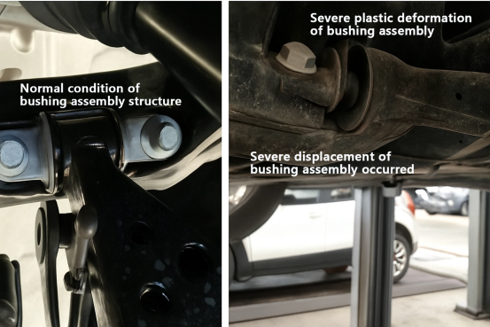 Viene effettuato un confronto tra un gruppo boccola del braccio di controllo normalmente funzionante (come mostrato nell'immagine in basso a sinistra) e un gruppo boccola difettoso (come mostrato nell'immagine in basso a destra). Sottolinea che confrontando le immagini sinistra e destra di seguito, è facile osservare che lo spazio nella normale boccola del braccio di controllo a sinistra è uniforme e non dovrebbero esserci piegature o deformazioni evidenti come mostrato nell'immagine a destra. Se un veicolo presenta le condizioni mostrate nell'immagine a destra, rappresenta già un pericolo per la sicurezza durante il funzionamento.