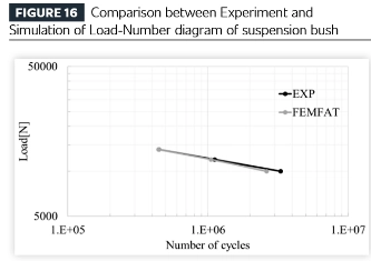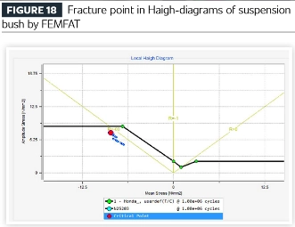 Successivamente, i risultati dell'analisi strutturale di cui sopra vengono trasferiti al modulo di analisi della fatica del software (in questo caso utilizzando il software FEMFAT di Magna ECS) e confrontati con i risultati dei test di durabilità. Il test e l'analisi dimostrano un'eccellente coerenza sia nella durata della fatica che nella localizzazione delle cricche.