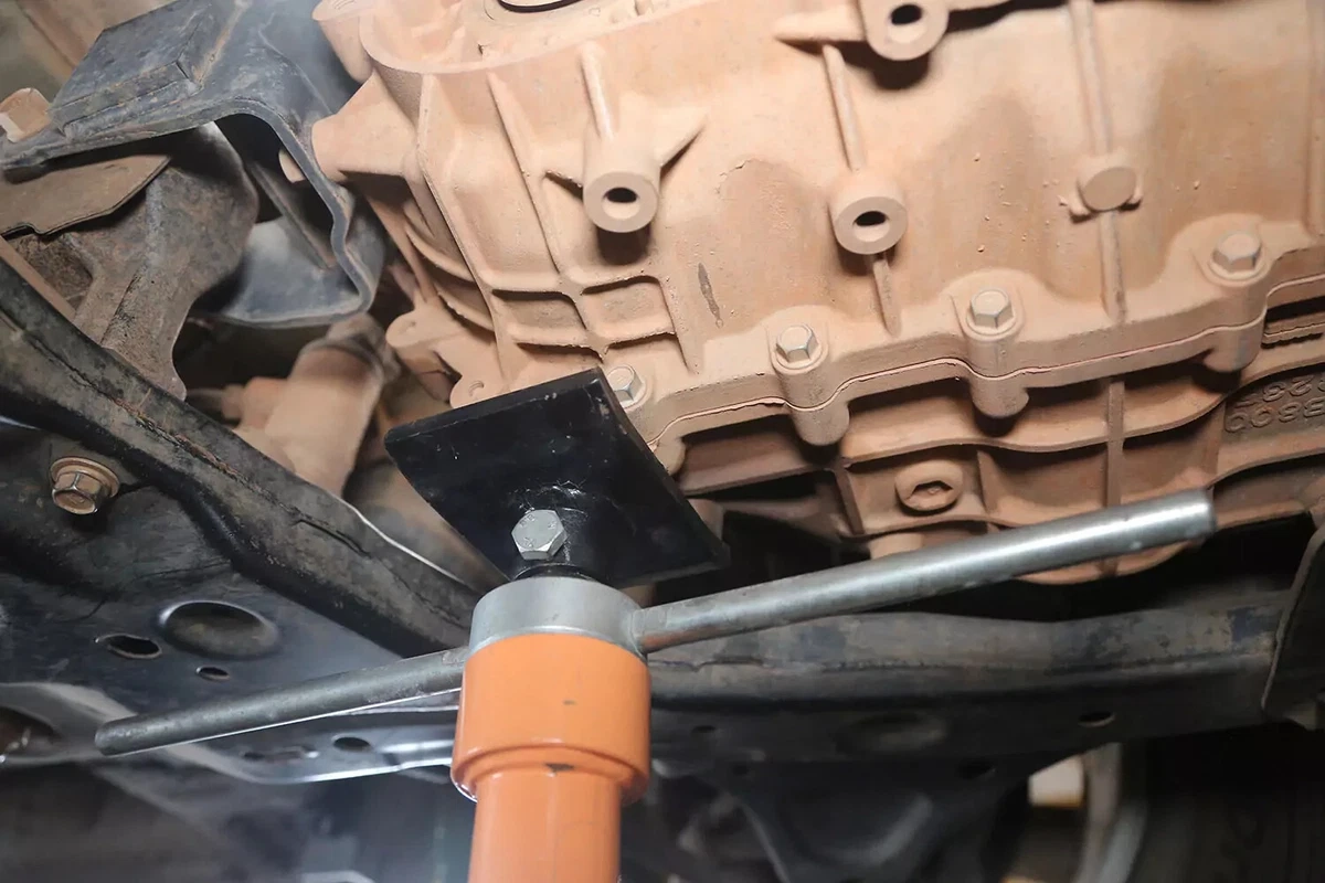 Sollevare la trasmissione quanto basta per estrarre il supporto. Tuttavia, un sollevamento eccessivo può mettere a dura prova gli altri supporti del motore e della trasmissione.