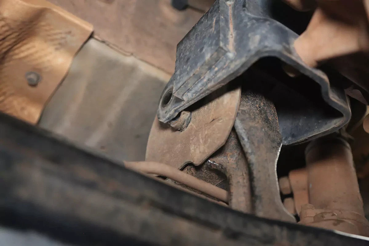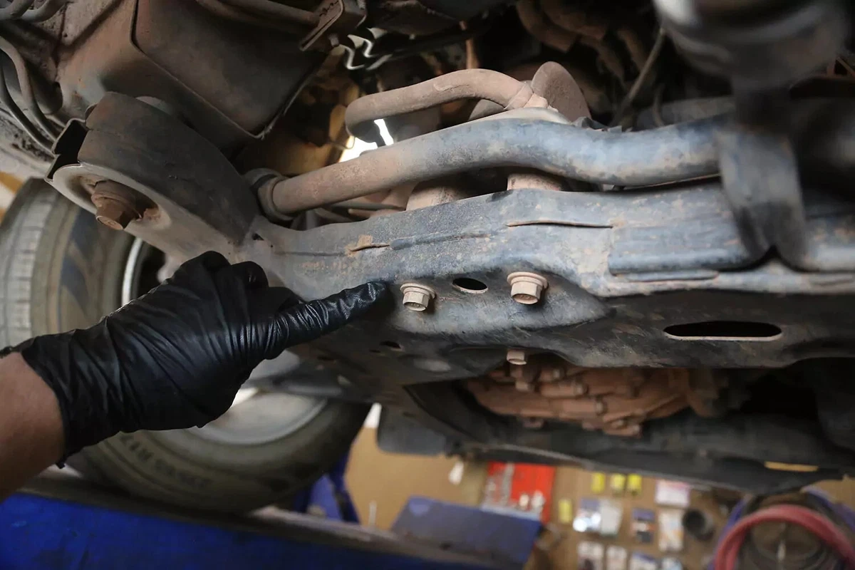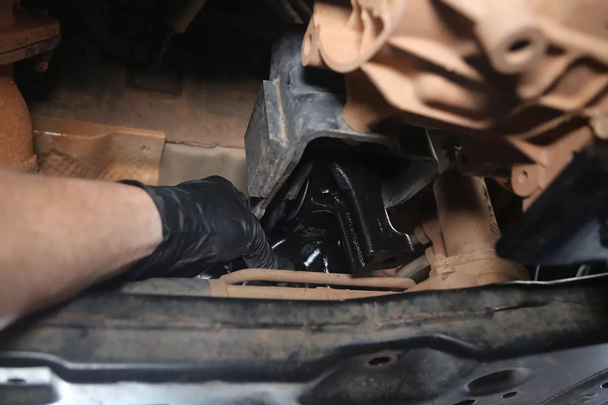 Sul nostro veicolo dimostrativo FWD, il supporto della trasmissione si trova dietro la trasmissione sul sottotelaio anteriore. Se hai un veicolo AWD, 4WD o RWD, il supporto si trova probabilmente nella parte posteriore della trasmissione, centrato quasi direttamente sotto l'auto, tra la trasmissione e la traversa.