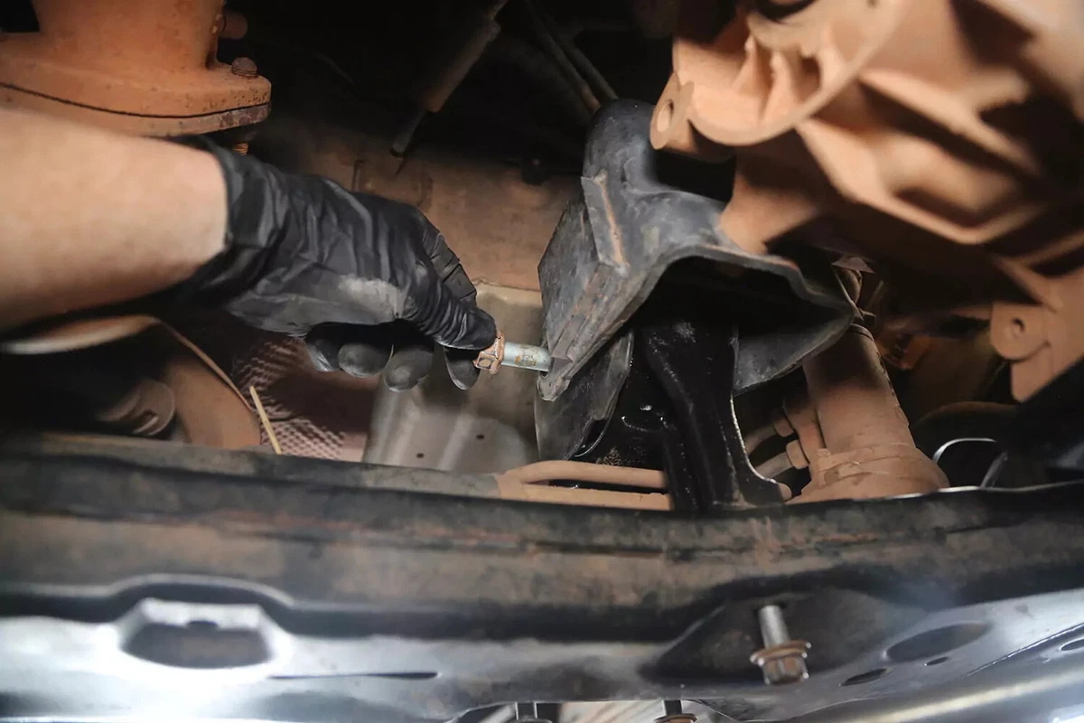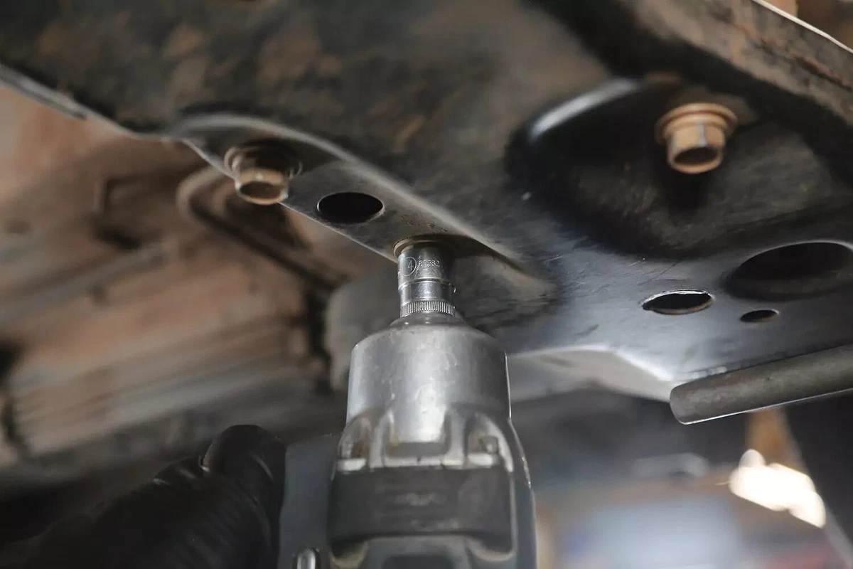 Per il nostro veicolo dimostrativo, il supporto ha tre bulloni sul sottotelaio e un bullone sulla trasmissione. Altri quattro bulloni fissano la staffa di montaggio della trasmissione alla trasmissione. Sulla maggior parte dei veicoli non è necessario rimuoverli.