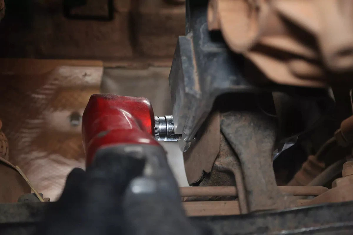Il nostro veicolo dimostrativo è dotato di un bullone a croce, che viene rimosso utilizzando una chiave da un lato e una presa dall'altro. Questi possono essere difficili da rimuovere in spazi ristretti. Utilizza una barra demolitrice, una chiave a percussione o una barra imbroglione per ottenere la leva necessaria.